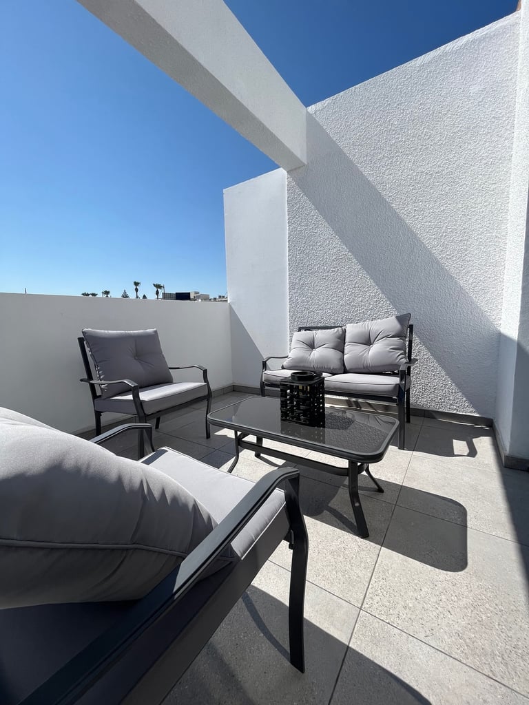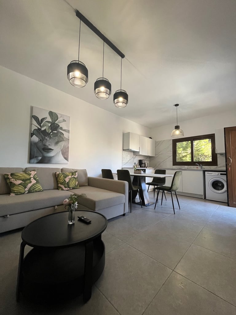The living room contains of a corner sofa that doubles as a bed. You can will find there a 50” smart TV, a stylish coffee table. The apartment has fully air-conditioning.