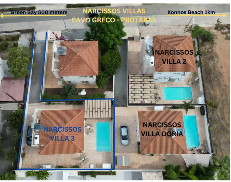 NARCISSOS VILLA 3 stands in a large, private plot with off-street parking and is located in the quiet Cavo Greco area of Protaras, between the two most popular tourist resorts in Cyprus; cosmopolitan AYIA NAPA and relaxing PROTARAS. The renowned KONNOS BAY is only 1 kilometer away and FIG TREE BAY is 2 kilometers away.