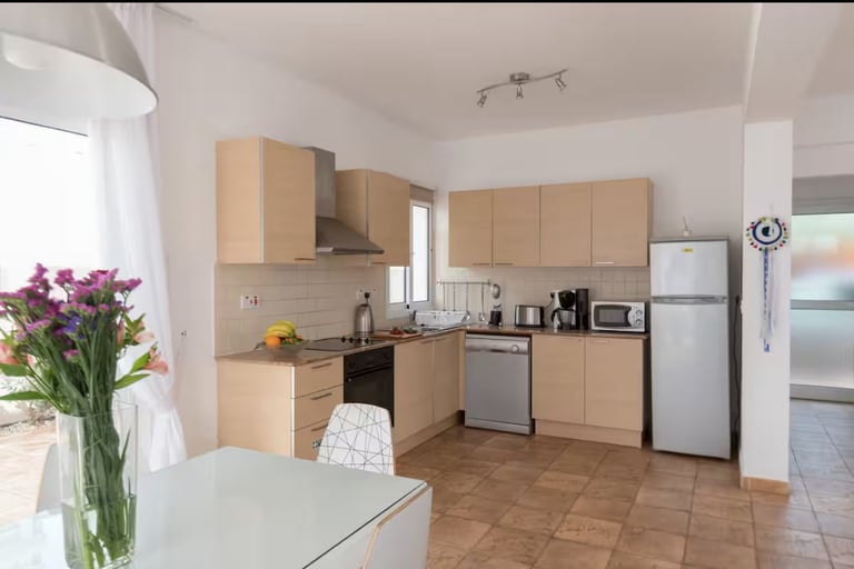 The villa is ideally located on the main bus route close to the popular resort of Protaras and the tranquil Cavo Greco area. It provides everything anyone needs for a carefree holiday in the sun! Having a sofa bed in the living room (140 X200 cm), the villa can comfortably accommodate up to 8 persons, 7th and or 8th person/s at extra charge. Nearest supermarket with 300 meters, nearest bus stop 400 meters from the villa.