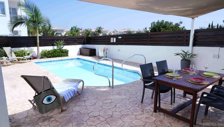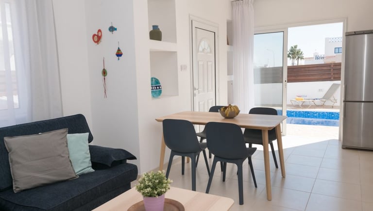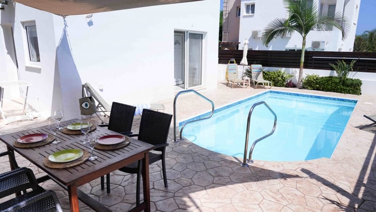 Set on a private plot with off-street parking, Villa Doria is located in the quiet area of Protaras (Cavo Greco), nestled between the bustling tourist spots of Ayia Napa and the serene Protaras. The renowned Konnos Bay is only 1 km away, and Fig Tree Bay is 2 km away. Villa Doria shares the same complex with Villa 2 and Villa 3, making it perfect for two or three families wishing to enjoy their holidays together.